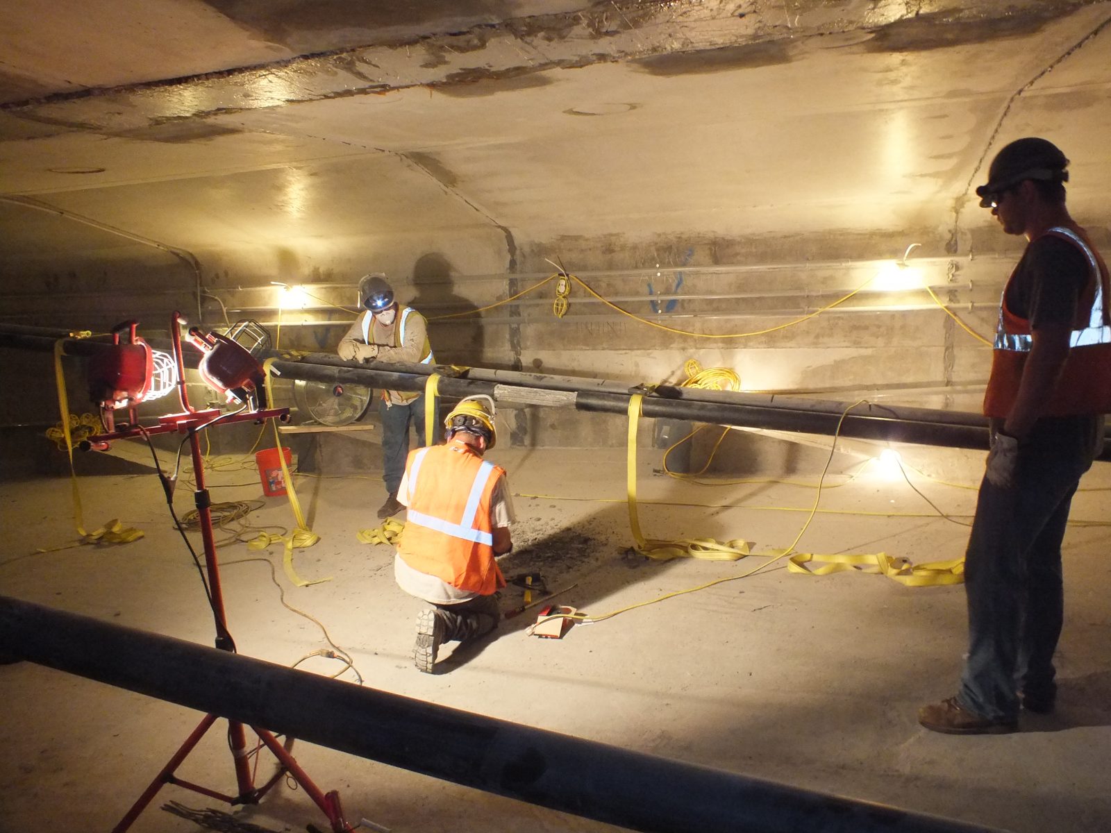 • Examining the strands in exploratory openings. This work requires assistance from highly skilled contractors to make openings in the concrete and grouted duct to expose the tendons without damage, and restore the grout, duct, and concrete after performing the examinations.