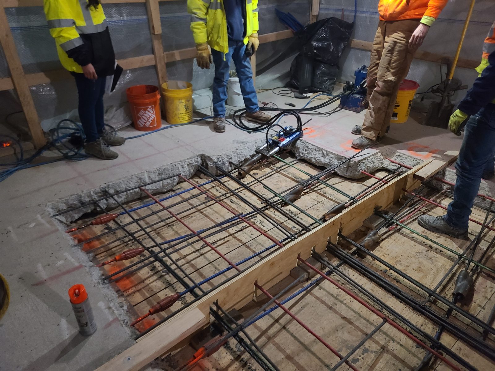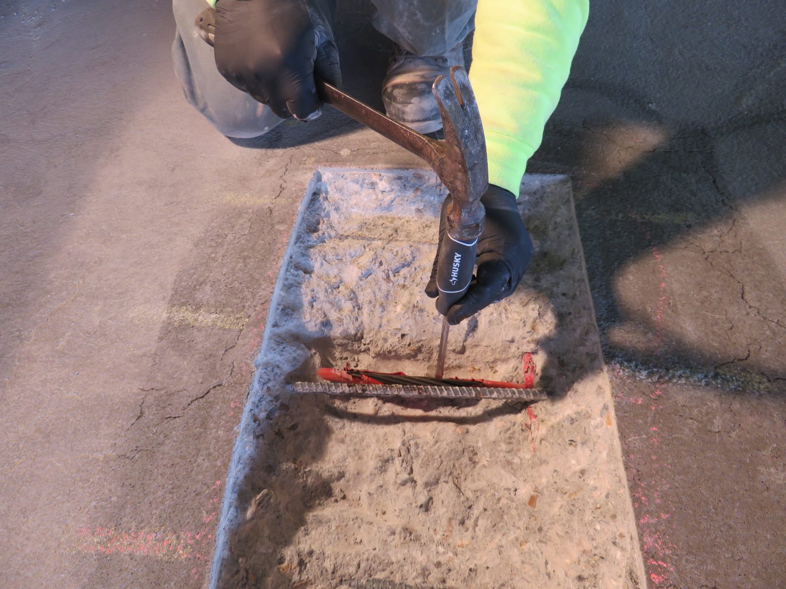 Exploratory opening to examine strands and grouting in bonded post-tensioning.