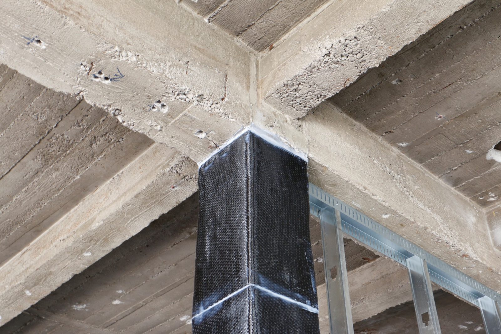 The lack of well-detailed and spaced steel hoops (referred to as ties) near the top and bottom of concrete columns at each floor is a common deficiency in older concrete buildings. Strengthening could be achieved by increasing the size of the existing beams and columns by casting new reinforced concrete around these elements. However, a relatively simple fix for this is to wrap the columns in fiber-reinforced polymer (FRP), a material often used in boat and vehicle construction. Carbon composites have a high strength-to-weight (as well as volume) ratio and save valuable rental space that would otherwise be lost to concrete encapsulation. In the Lane project, we used carbon composite fibers to confine the concrete and strengthen the existing beams and columns.