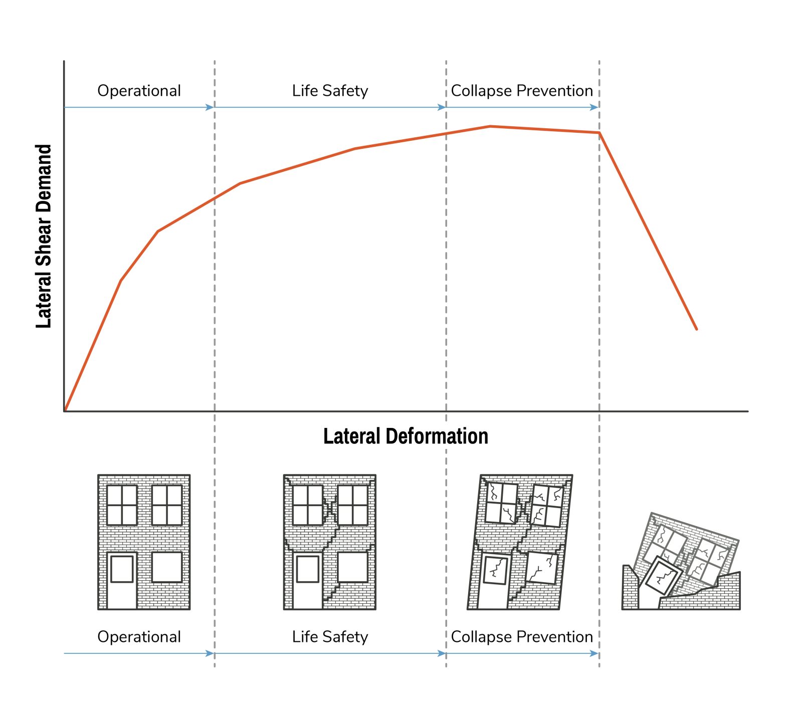 Performance-based design (PBD) has gained tremendous popularity over the last twenty years. Using this method, the engineer can evaluate any type of building for any level of earthquake. For example, an oft-used performance target for existing buildings is the Basic Safety Objective for Existing Buildings (BSOE) in the national standard ASCE 41 – Seismic Evaluation and Retrofit of Existing Buildings. The BSOE is intended to achieve life safety performance for a strong earthquake (an earthquake with a 250-year return period) and collapse prevention performance for a severe earthquake (1,000-year return period). See the figure below for a graphical representation of the performance limit states for buildings.