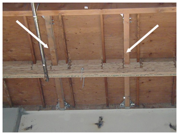 For simplicity, the following discussion assumes wood roof framing and diaphragms, which are common in older RWFD construction. A similar discussion applies to metal roofs. The evaluation is more straightforward if original design drawings and any modification drawings are available. In the absence of drawings, it may be necessary to remove portions of the roofing to verify the presence and type of wall anchors and plywood nail pattern and to investigate other building details using both nondestructive and destructive testing.