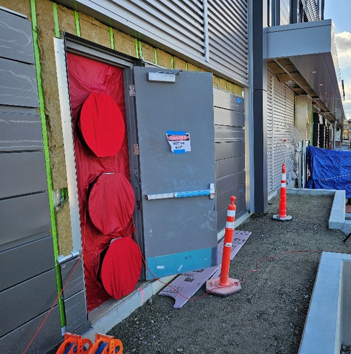 Blower door setup for air leakage testing.