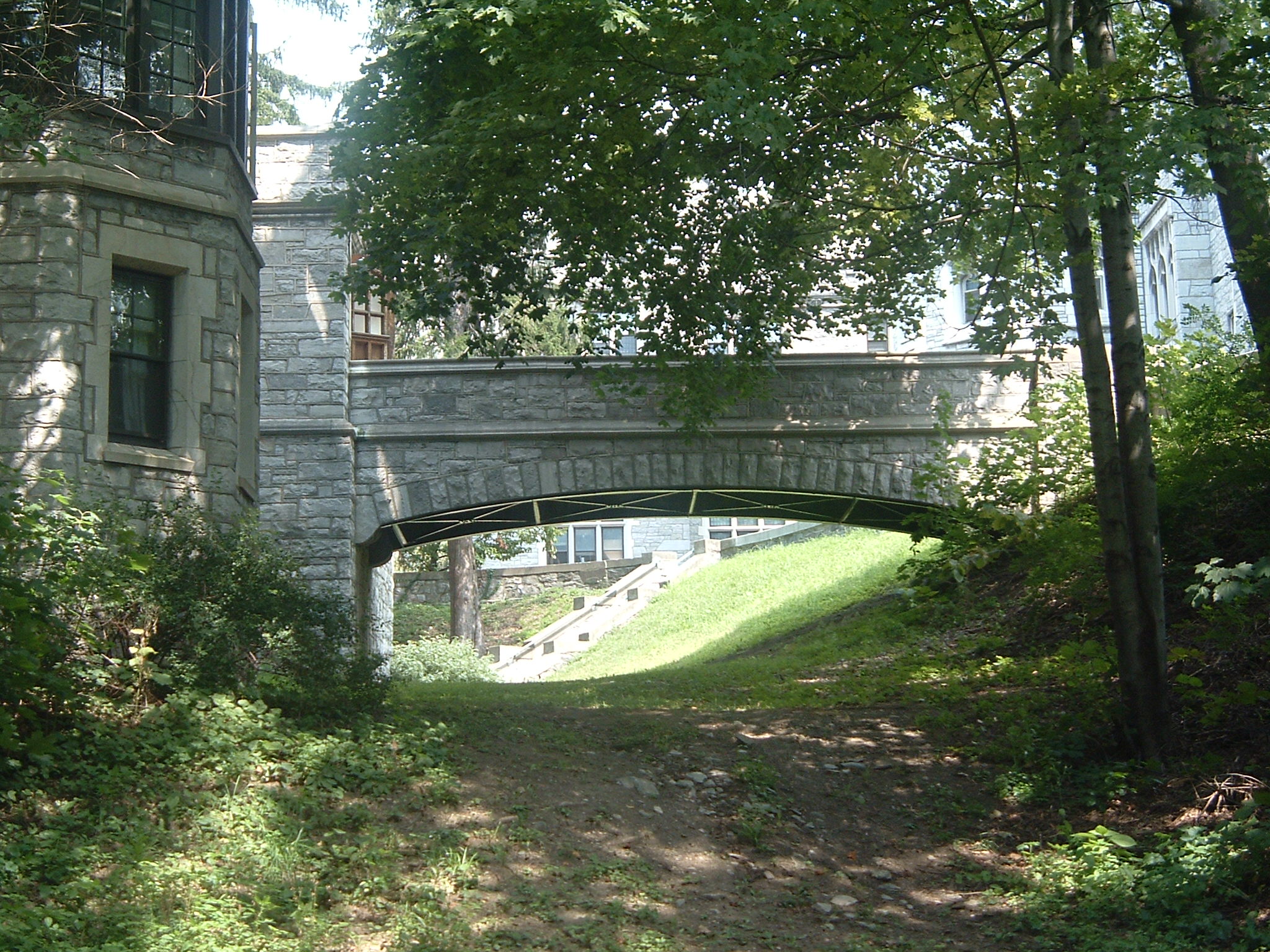 After completing the condition assessments and immediate masonry stabilization, we prepared design documents and oversaw the partial reconstruction of two additional towers and the historic masonry-clad bridge on campus.
