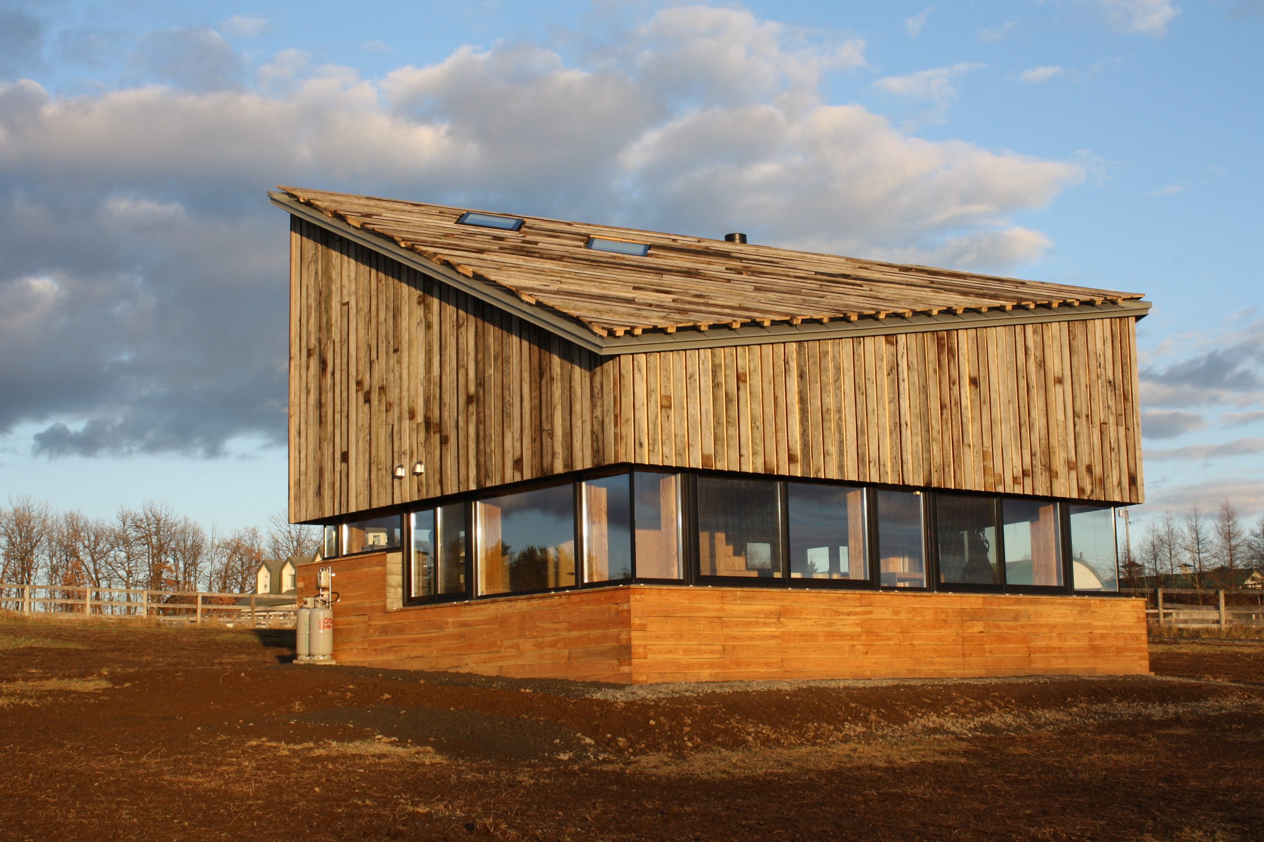For construction of the house, the team relied on locally-produced materials and other existing regional resources, including salvaged farm fencing, abandoned structures, and forestry plantations. The massive wood base, a modular assembly of railroad ties, required minimal embodied energy and may be easily disassembled and recycled in the future.