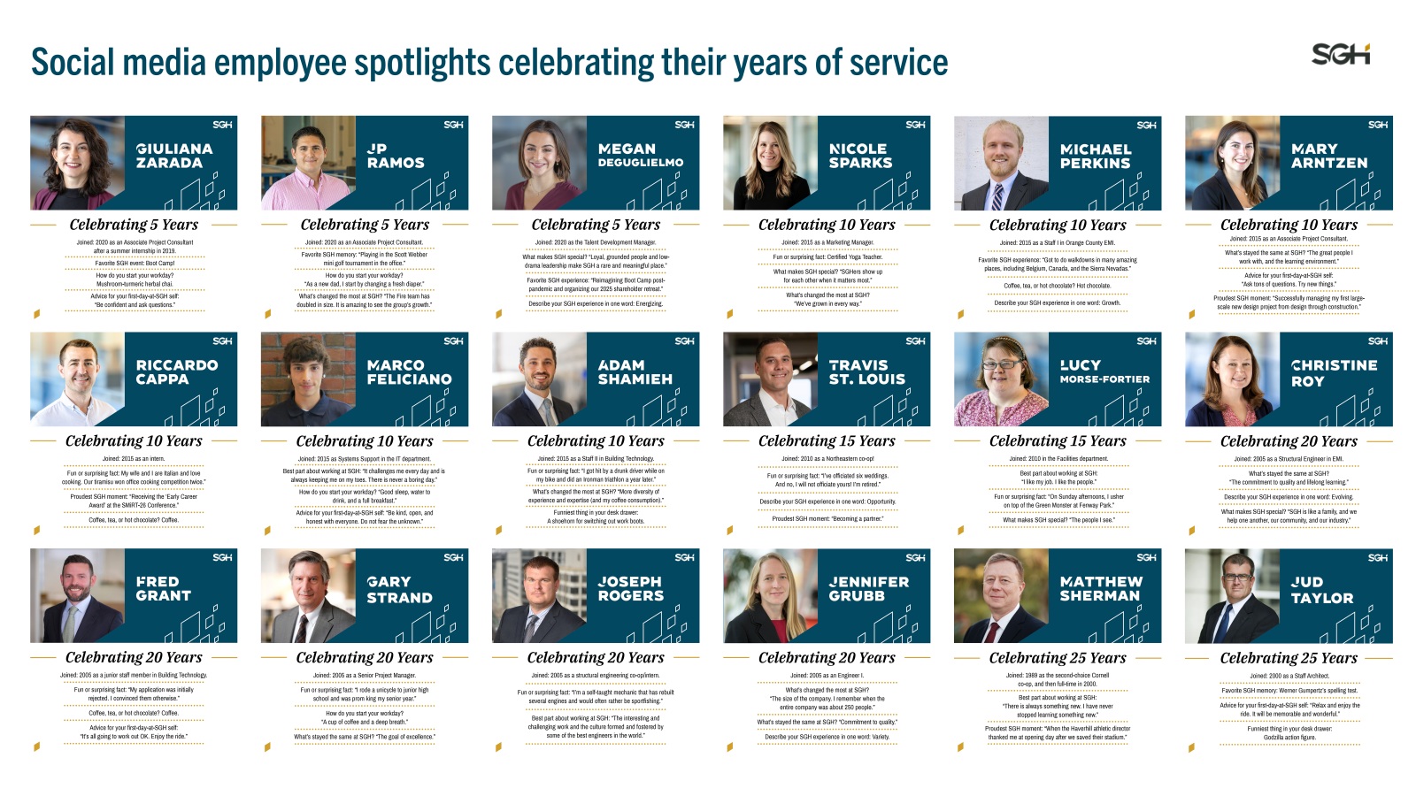The campaign generated strong internal engagement and extended reach across SGH’s digital channels. More importantly, it reinforced that long careers are not incidental at SGH—they are cultivated. By pairing personal stories with firmwide participation, the campaign honored individual contributions while underscoring the continuity that shapes our future.